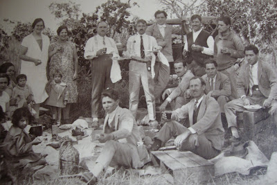Meu pai (com ar de menino) à direita, acabado de chegar a Angola em 1920, recebido por seus quatro irmãos, todos a partir da esquerda. Por graça a foto seguinte, de um piquenique na mesma época, com familiares e amigos.