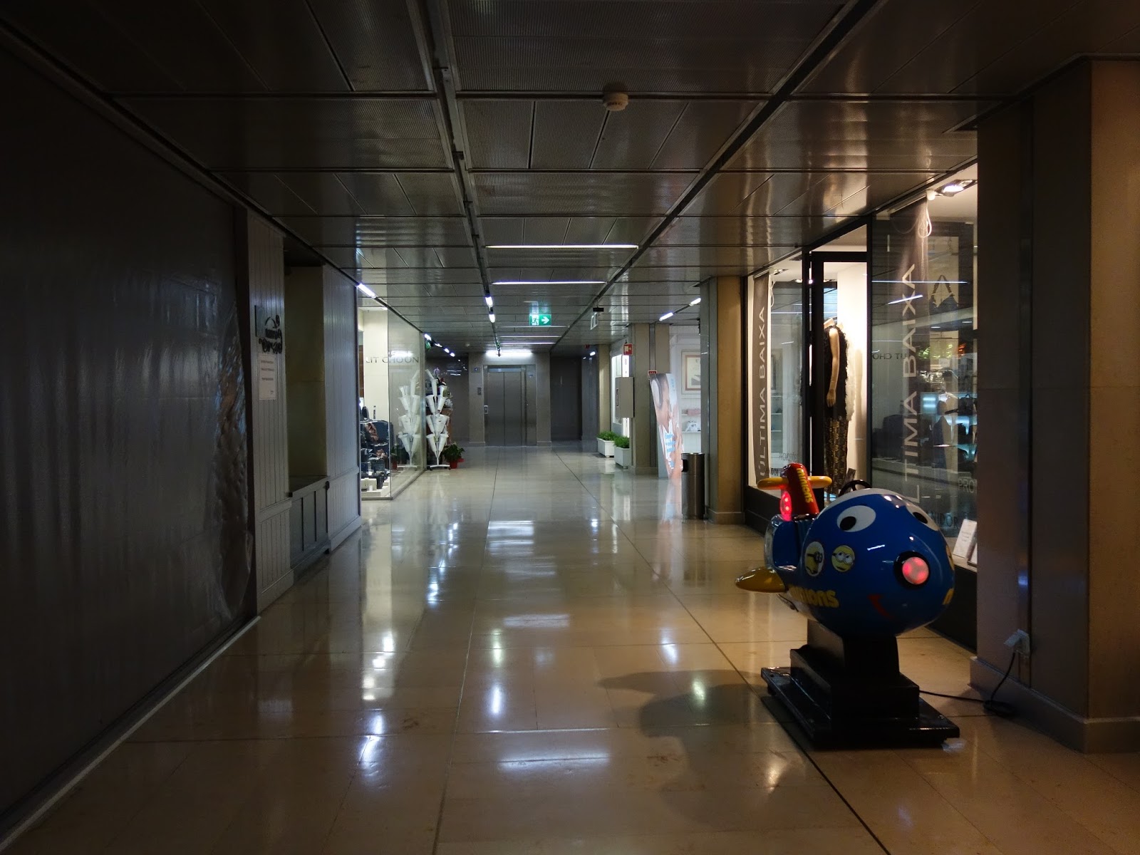 Vejo o corredor de um centro comercial igual a tantos outros. Vejo as montras de encantar adultos e o aparato de aliciar crianças. Vejo a iluminação fria, adequada e desumana.