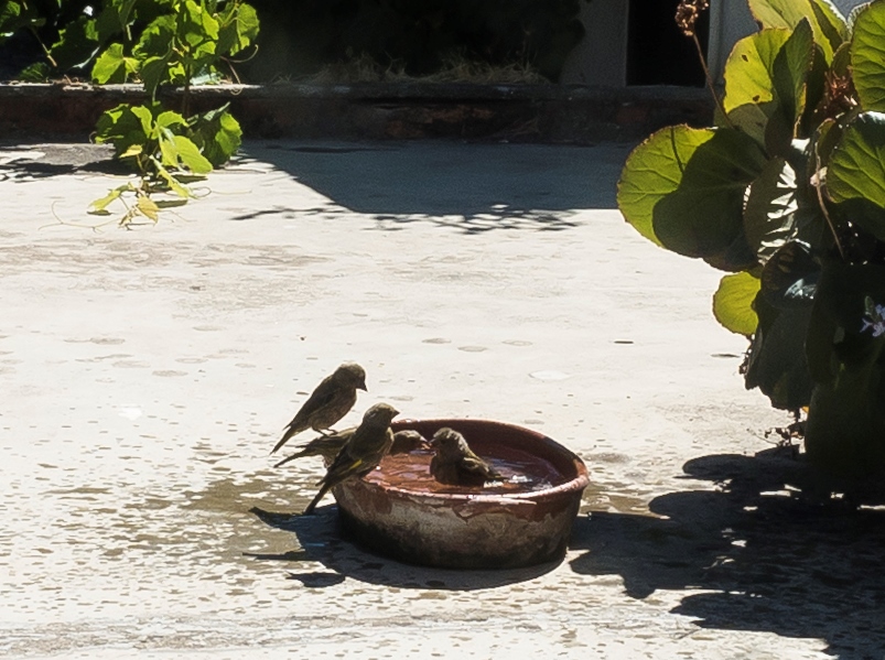 Pouco passava do meio-dia. O sol no zénite, o ar pesado de calor. O jardim silencioso e parado, como só acontece num dia de verão. De repente, vindos sei lá de onde, poisam os 4 na banheira privativa do casal de melros-visita-diária, e ali ficam, retrato da liberdade e da alegria, a brincarem com a água e com o tempo…