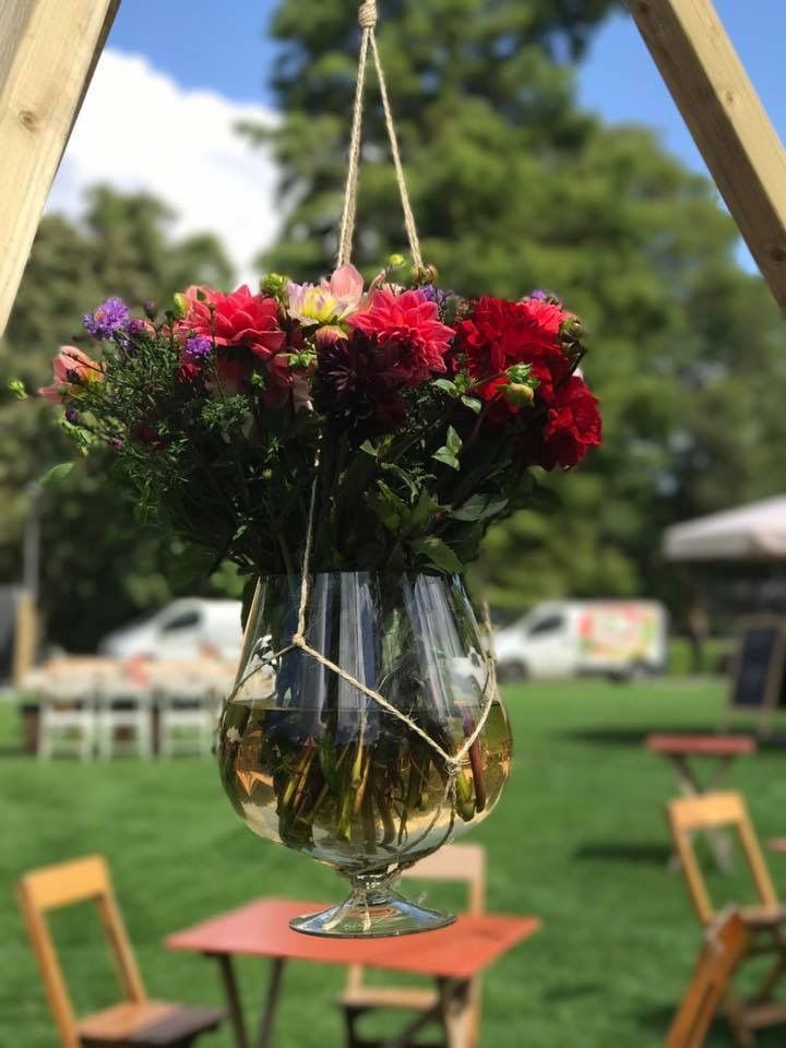 cálice gigante a servir de jarra a um braçado de dálias, suspenso